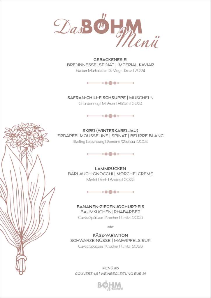 Ein Highlight ist unser Böhm-Menü: ein saisonales 5-Gänge-Erlebnis mit kreativen Kombinationen. Auf Wunsch begleitet eine erlesene Weinauswahl jedes Gericht.